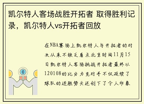 在NBA赛场上,凯尔特人与开拓者的对决从来不缺乏看点。北京时间11月15日,凯尔特人客场挑战开拓者,最终以120:108的比分力克对手,不仅延续了球队的连胜势头,还创下了令人印象深刻的胜利记录。这场比赛不仅展现了凯尔特人强大的团队实力,也让球迷们看到了他们冲击更高目标的潜力。